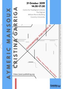 This is the third in a series of symposia hosted by the Centre for Postdigital Cultures (CPC) exploring contemporary approaches to experimental publishing. Over the course of the series, we will ask questions about the role and nature of experimentation in publishing, about ways in which experimental publishing has been formulated and performed in the past, and ways in which it shapes our publishing imaginaries at present. This series aims to conceptualise and map what experimental publishing is or can be and to explore what lies behind our aims and motivations to experiment through publishing. As such, it forms the first activity within the CPC’s new Post-Publishing programme, an initiative committed to exploring iterative and processual forms of publishing and their role in reconceptualising publishing as an integral part of the research and writing process, i.e. as that which inherently shapes it.